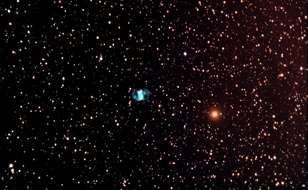 The Dumbbell Nebula (also known as Apple Core Nebula, Messier 27, M27, or NGC 6835) is a planetary nebula in the constellation Vulpecula at a distance of about 1,360 light-years. the object was the first planetary nebula to be discovered; by Charles Messier in 1764. At its brightness of visual magnitude 7.5 and its diameter of about 8 arcminutes, it is easily visible in binoculars, and a popular observing target in amateur telescopes. the Dumbbell Nebula appears to be shaped like an prolate spheroid and is viewed from our perspective along the plane of its equator. In 1992, Moreno-Corral et al. computed that its rate of expansion in the plane of the sky was no more than 2.3″ per century. From this, an upper limit to the age of 14,600 yr may be dtermined. The central star, a white dwarf, is estimated to have a radius which is 0.055+0.02 R which gives it a size larger than any other known white dwarf.
