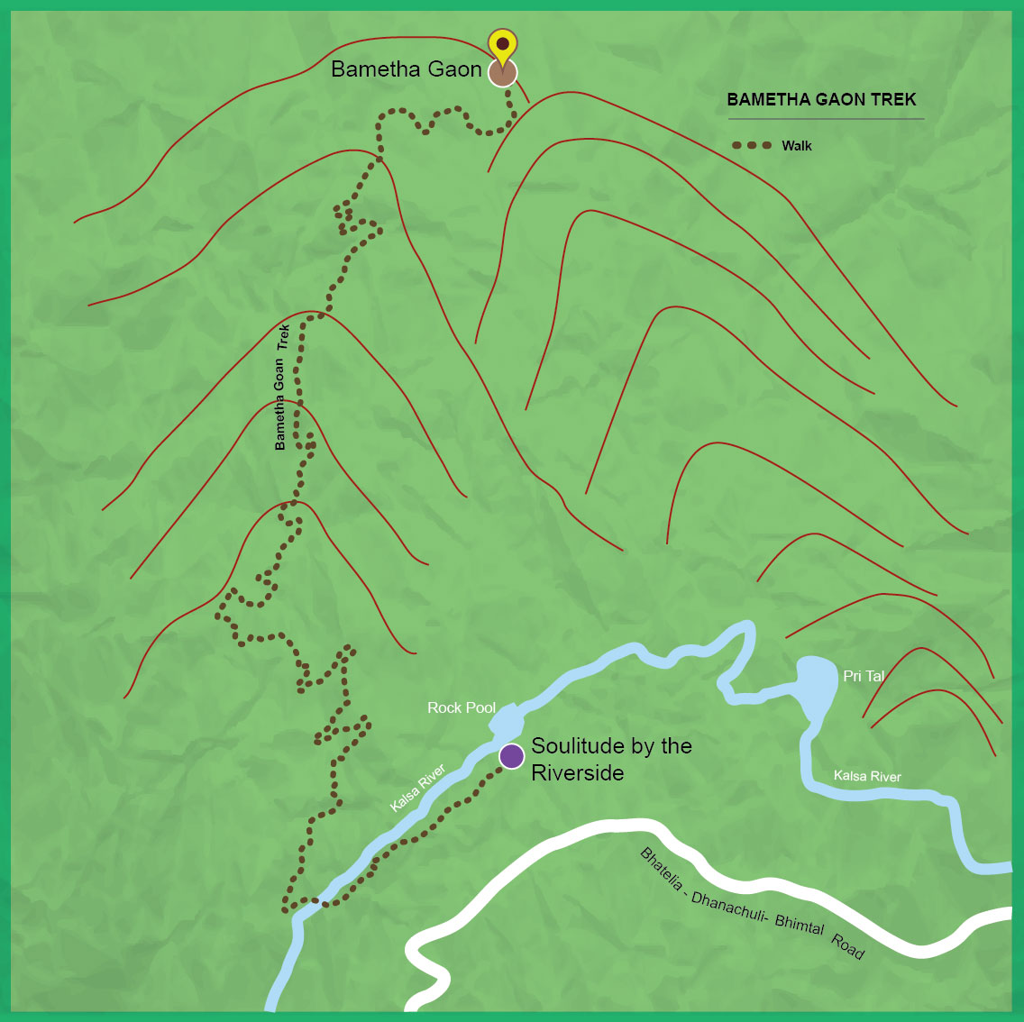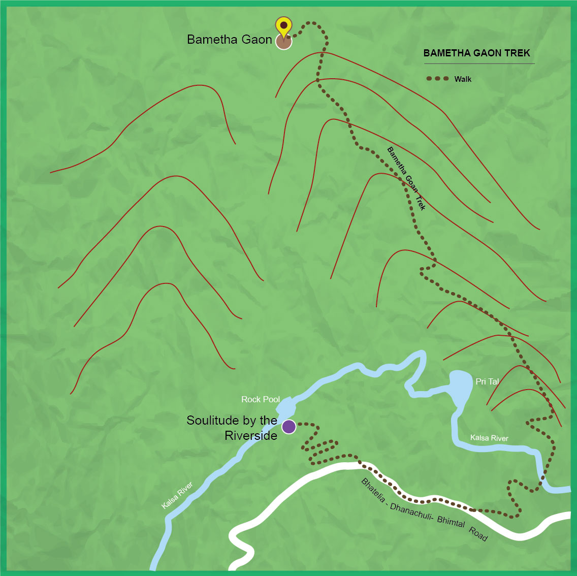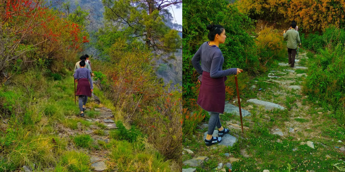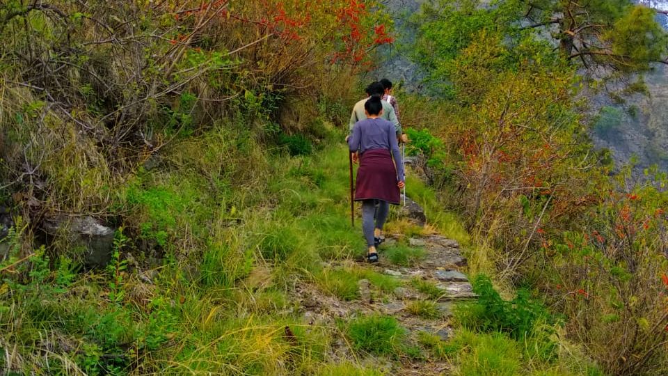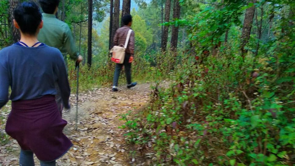 There is however another version of this trek, whereby, one can take the Pine forest trek from Soulitude up to the road head. From here, there is a possibility of taking an hour long car ride to Bametha Gaon, so the uphill trek to the village can be avoided. From Bametha Gaon, either of the two routes mentioned above can be taken back to Soulitude.
