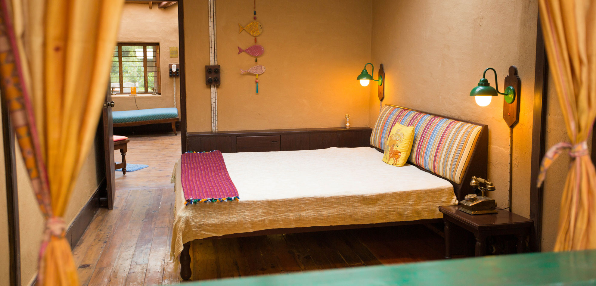 Sum overlooks reflection pool and the garden beyond which flows the river. It is situated within the 1930’s village home that has been restored using traditional methods and with the addition of all modern comforts without compromising the authenticity. It radiates a vibrant earthy appeal and has been decorated in true rustic style with mud plastered walls, old click switches, lantern lights and vintage-style furniture. The 360-degree view of the imposing hills all around, also seen through its skylights, is sure to fill you with a sense of awe!